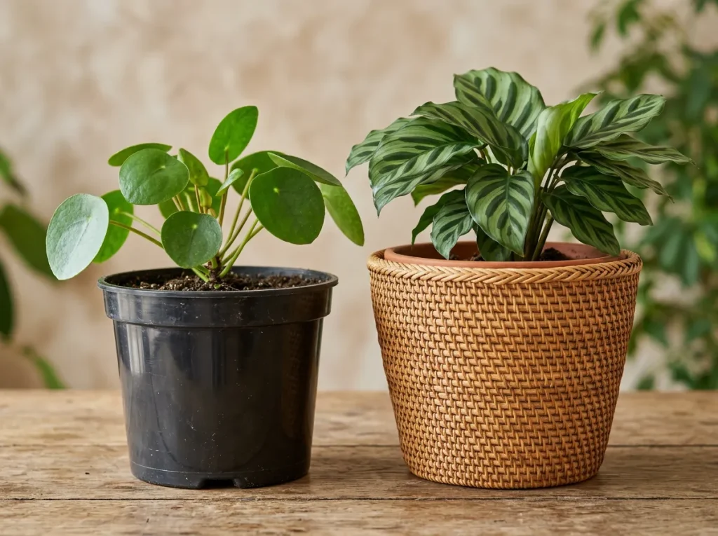 風水的には陶器や籐(ラタン)などの自然素材が良いですが、どうしてもプラスチックを使う場合は、高級感のあるデザインを選んでください。安っぽく見えないことが重要です。また、土を隠す「ココヤシファイバー」などで表面を覆うと、自然の要素がプラスされ運気が安定します。
