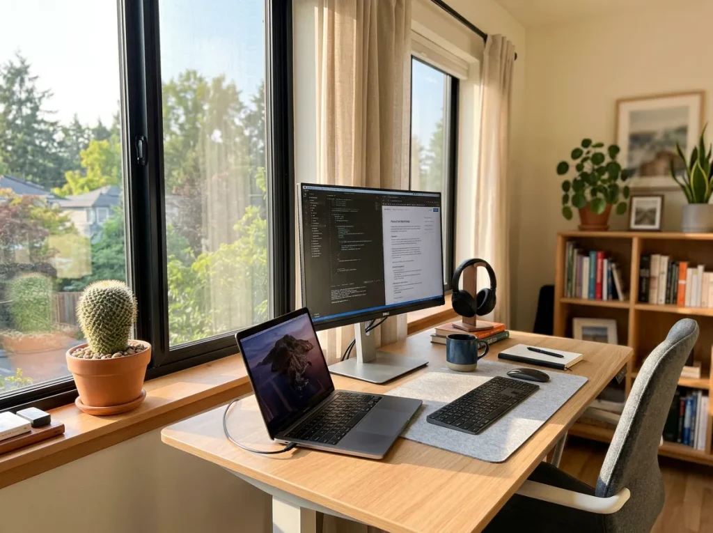 パソコンのすぐ横は避け、足元や少し離れた窓辺に置くのがおすすめです。適度な距離感が集中力を保ちます。