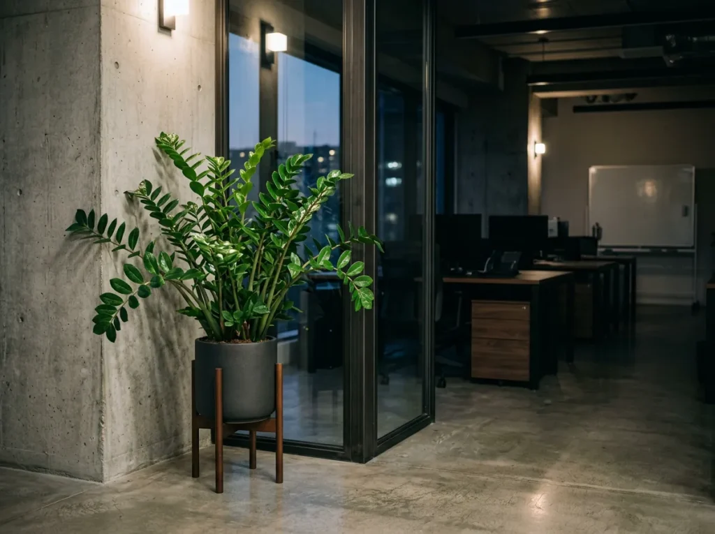 他の植物が枯れ果てている中、オフィスの隅で青々とした葉を保っていた植物がありました。それが「ザミオカルカス」です。土はカラカラに乾ききっていましたが、地下の芋に蓄えた水分と、わずかに差し込む隙間光だけで命を繋いでいたのです。