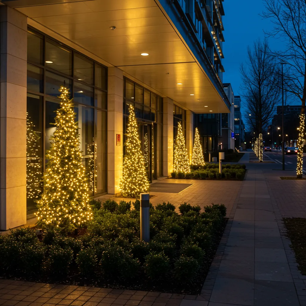 ビルや商業施設の入口を華やかに演出するイルミネーション施工。LEDライトやツリー設置で空間を明るく彩り、来訪者に安心感と華やかな第一印象を与えます。