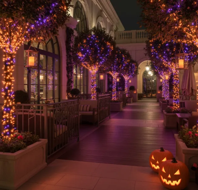 商店街やレストラン・カフェテラス、マルシェの雰囲気を高め、夜間の回遊・滞在を促すライトアップ演出。秋にはハロウィン演出で、イベント性を強めることもできます。