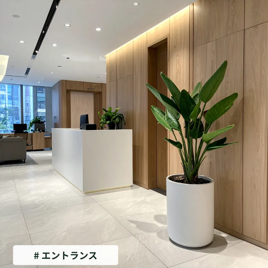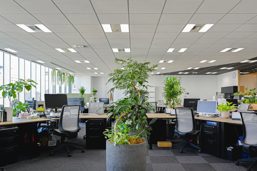 オフィス移転に合わせ、設計段階からグリーン配置をご提案いただきました。 シンボルツリーを中心に、開放感とコミュニケーションを両立した空間が完成。 どこにいても植物を感じられる、心地よいオフィスになりました。