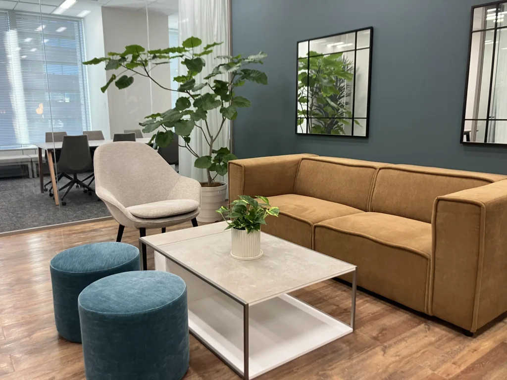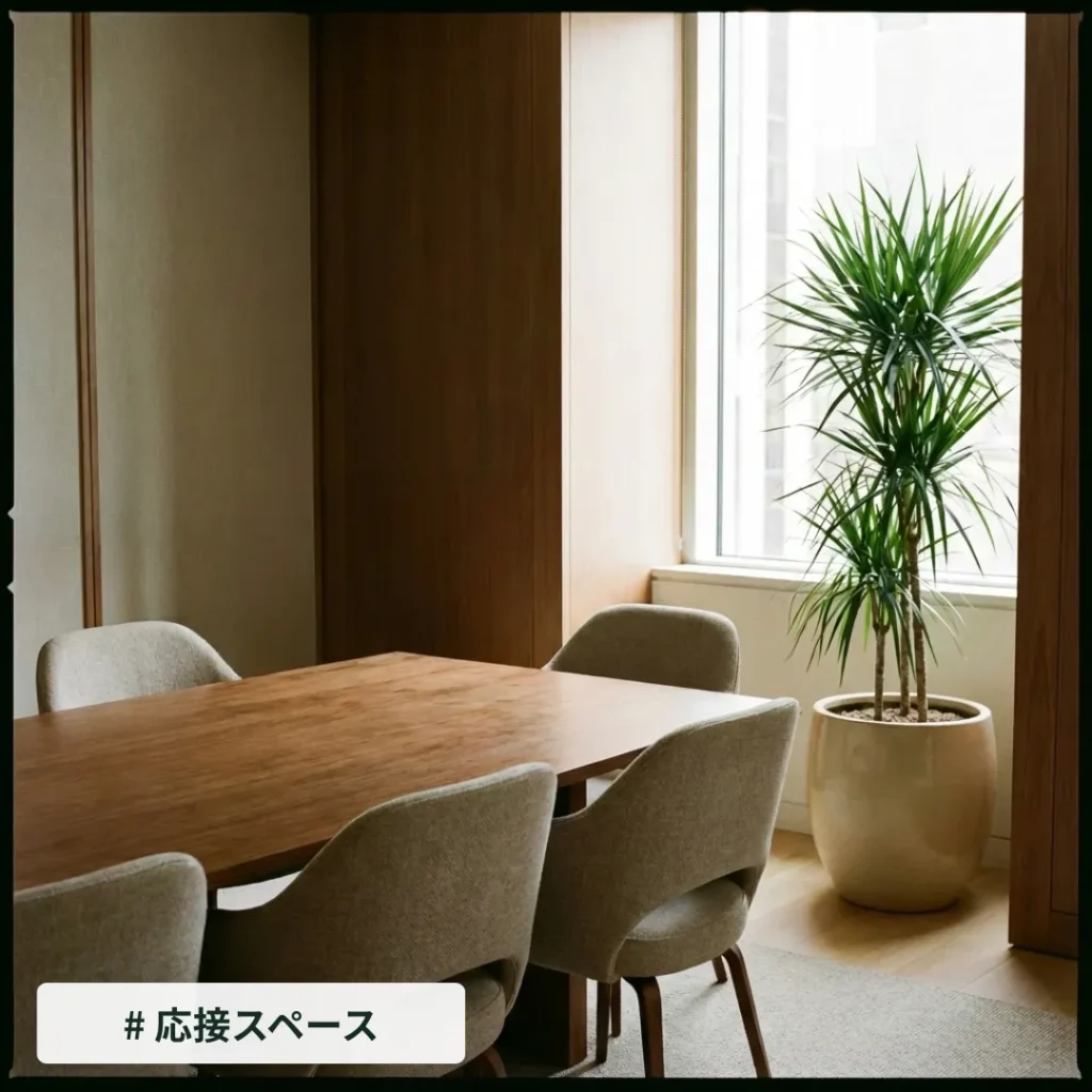 落ち着いたトーンのお洒落なオフィスに、雰囲気に合う観葉植物をコーディネート。 グリーンが加わることで、自然と会話が生まれる心地よい空間になりました。 日々の業務の中でも、ふとリラックスできる時間を演出しています。